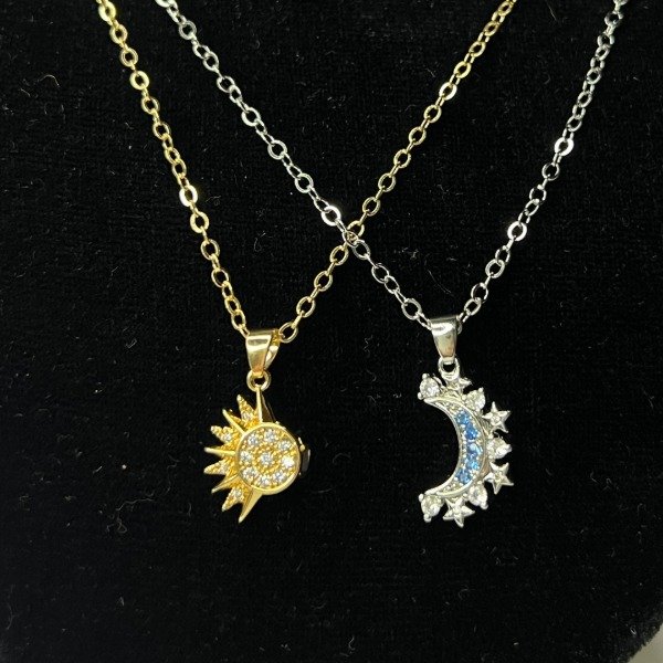 Precio por los dos collares, cadenas y dijes de METAL. Se recomienda no mojar, no exponer a cremas, liquidos de limpieza o ambientes humedos